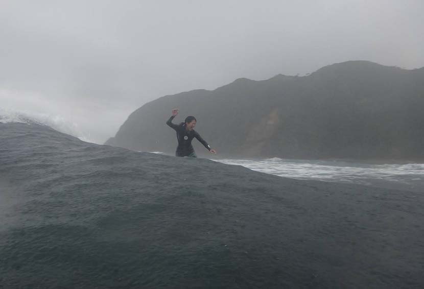 向こうにかすむ大岩の手前にそのショートボード波があるという。