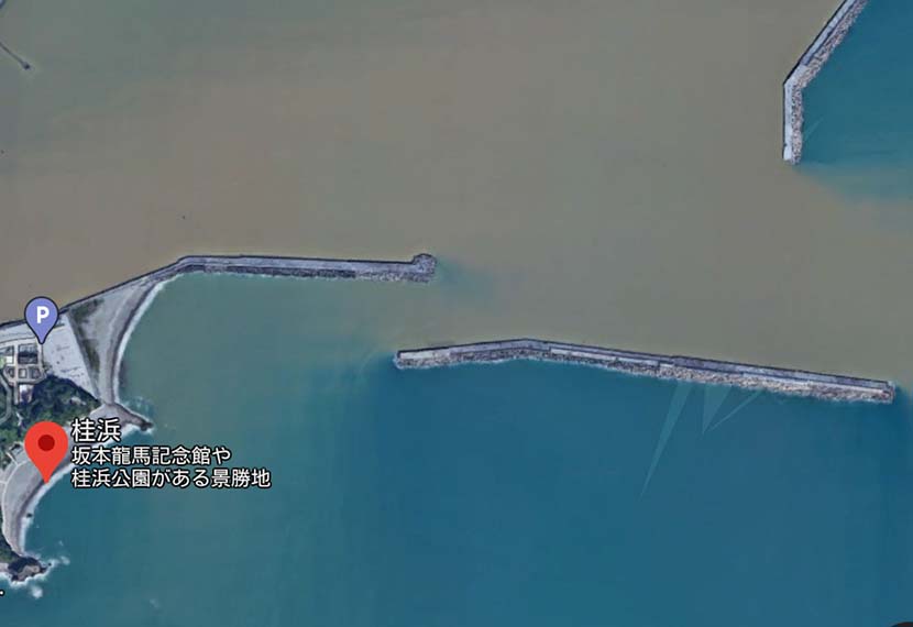桂浜の北東側に突き出ている堤防をGoogle mapを使って衛星写真で見て、