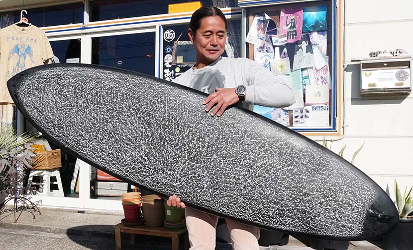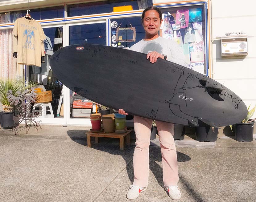 拝むべきサーフボードを秋山くんが手にとって見せてくれた。