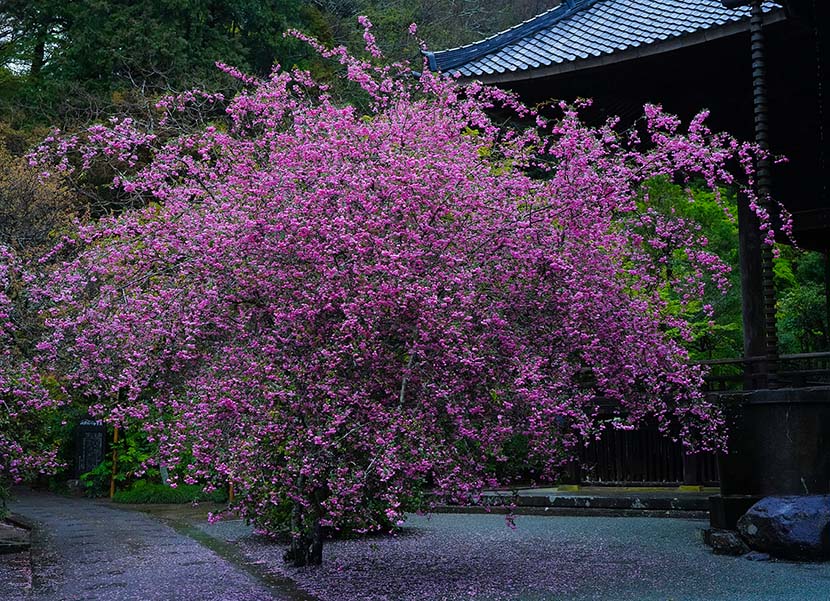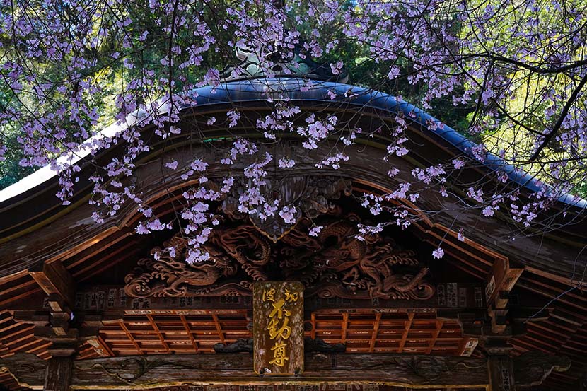 本堂の木彫り龍が桜色でにじんだ。