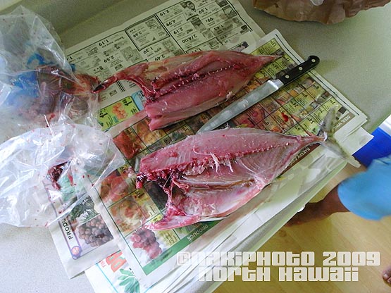すると、ウッドが釣ったマグロを届けてくれて、庖丁人カビカによる解体作業と相成りました。