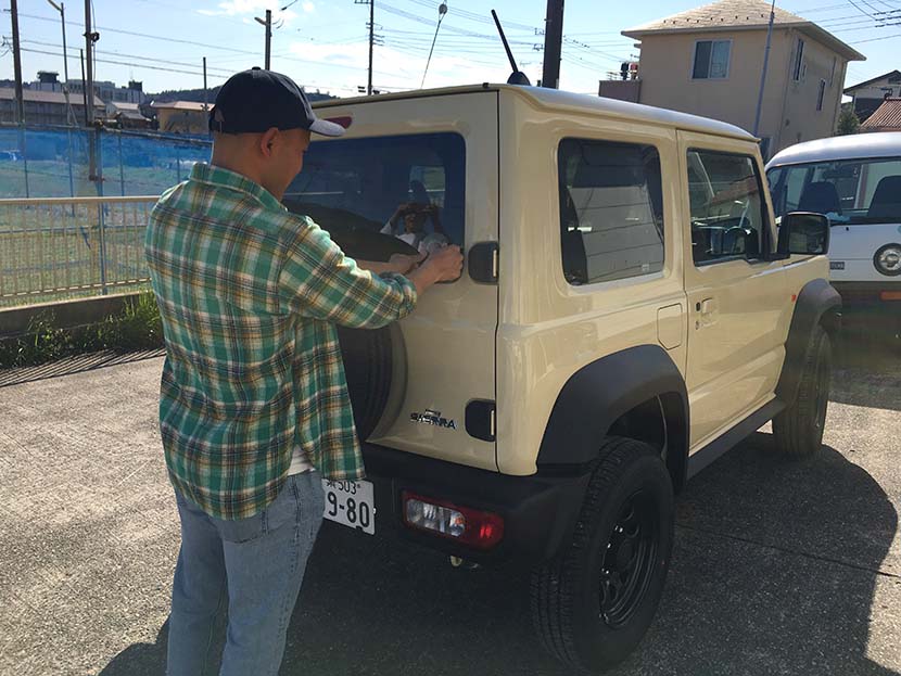 迷いなくタイラー&NAKISURFロゴを新車に貼ってくれた。