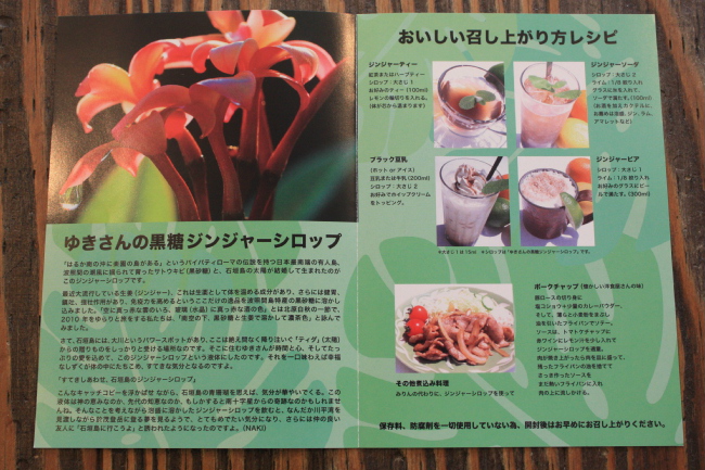 先日のnaki’s blogでもご紹介した『黒糖ジンジャーシロップ』の新しいパンフレットが石垣島のゆきさんから届きました。