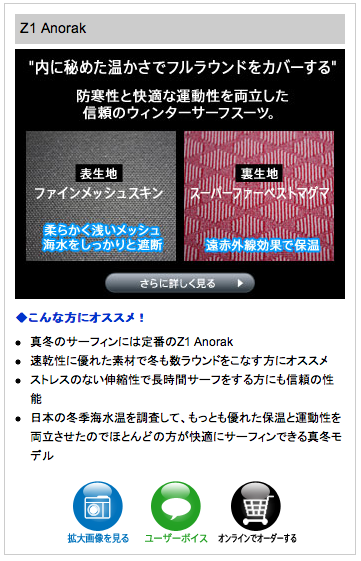 みなさんもうお気づきの方も多いと思いますが、Z1 サーフスーツのページがリニューアルされました。