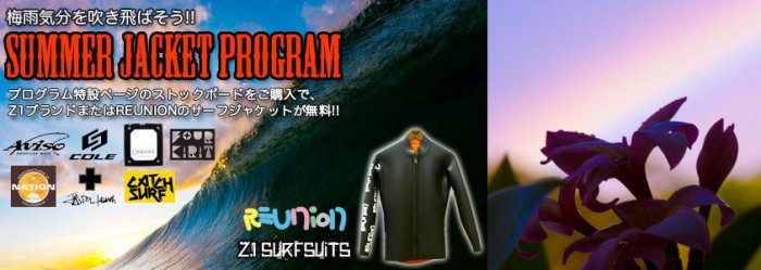 対象ボードをご購入いただくとZ1サーフスーツやREUNIONのタッパー、ジャケットが