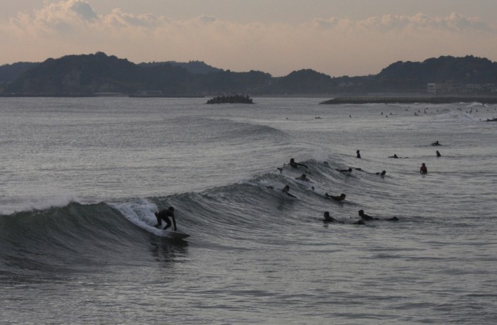 冬の冷たい海、一本わずか数秒間の波に乗るために、