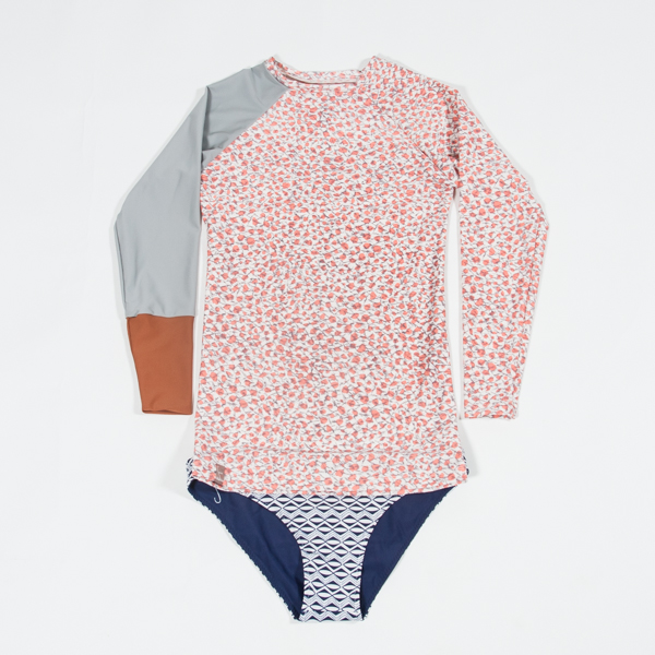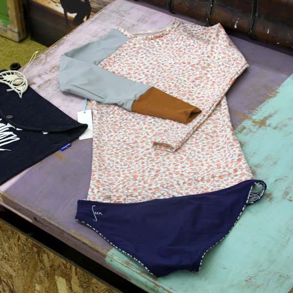 次は同じくラッシュガードでも、Dohenyより少しガーリーなデザインのHermosa Swimshirtsのコーディネート。