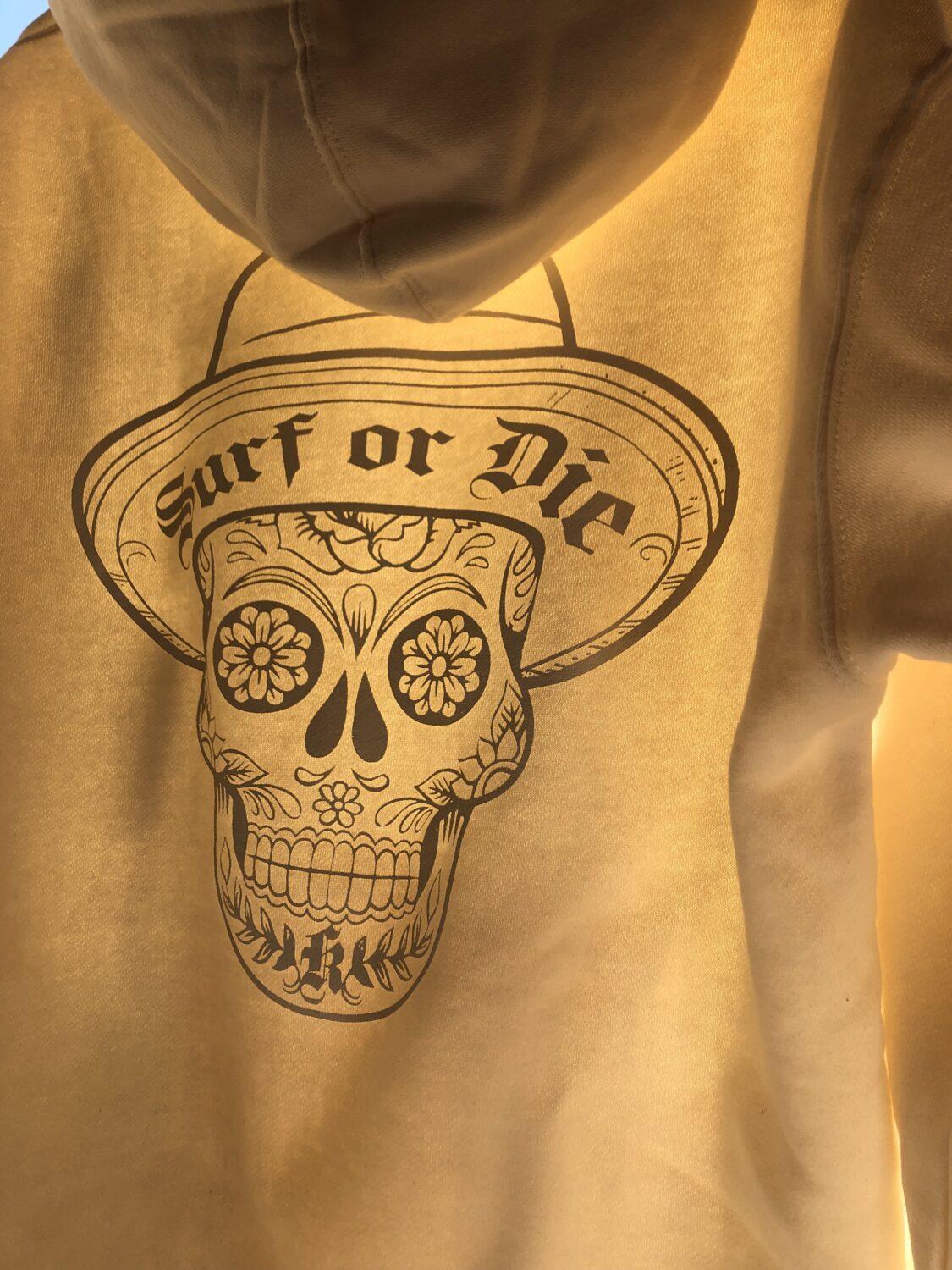 はっきりとした主張の「Surf or Die」メキシカンスカルのデザインが、